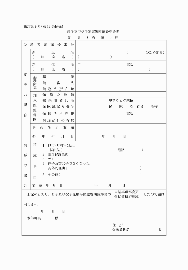 第13条 受給者は、受給者証を破り、汚し、又は失ったときは、母子及び父子家庭等医療費受給者証再交付申請書(様式第4号)により町長に受給者証の再交付を申請することができる。