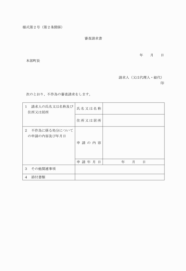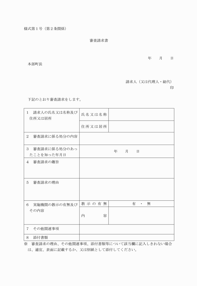 第6条 利害関係人が参加人として当該審査請求に参加しようとするときは、参加人許可申請書(様式第5号)を町長へ提出するものとする。