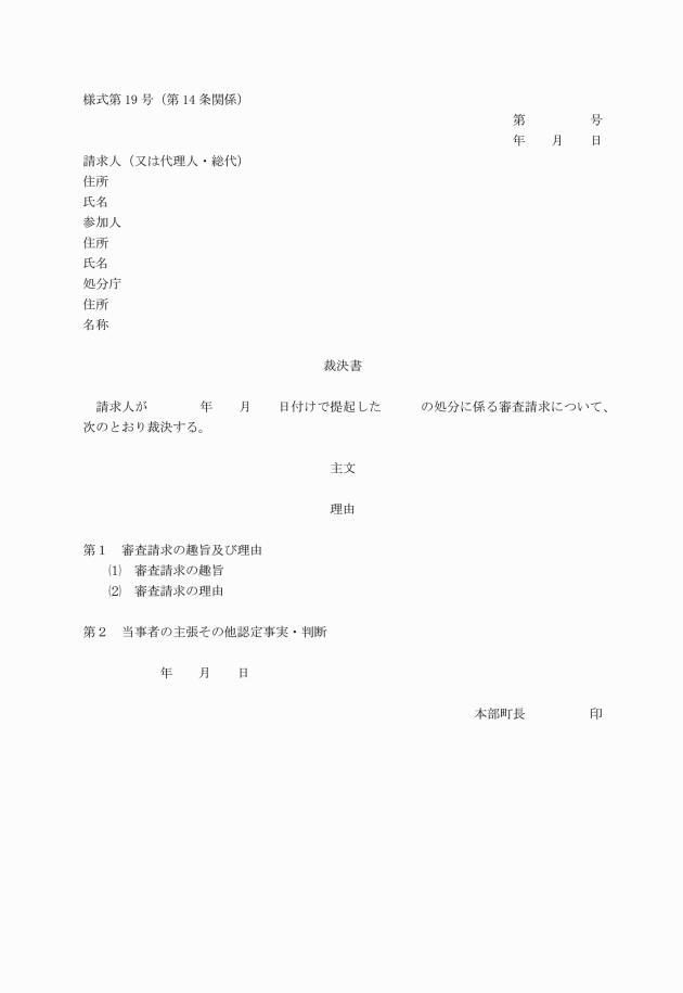 当該処分を変更する場合 | 町長(処分庁)が 年 月 日付けで審査請求人に対してした○○○○処分を○○○○との処分に変更する。 | |||