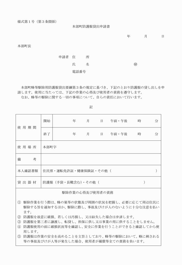 第3条 防護服の貸し出しを受けようとする者(以下「使用者」という。)は、本部町防護服貸出申請書(様式第1号)を町長に提出しなければならない。ただし、全着貸し出している場合は、返却があり次第申請書の受理月日が早い者から順次貸し出しを行うものとする。